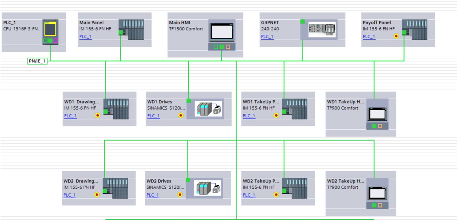 The wire drawing line schematic illustrates the reduced component count in the system solution for motion control, which held the desired tension requirements, saved money and made a considerably smaller footprint in the plant.