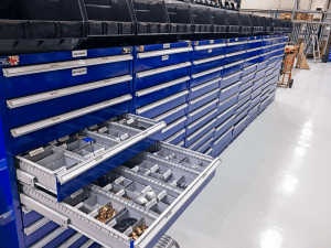 Organizationally, the center has shelving for vertical storage (18’ racking), industrial cabinets for organized parts storage and separate and dedicated stock areas. Further, Suhner has hired additional staff to offer better customer service to clients. This service includes onsite training in operations and maintenance of Suhner automated tooling equipment and other products in the line.