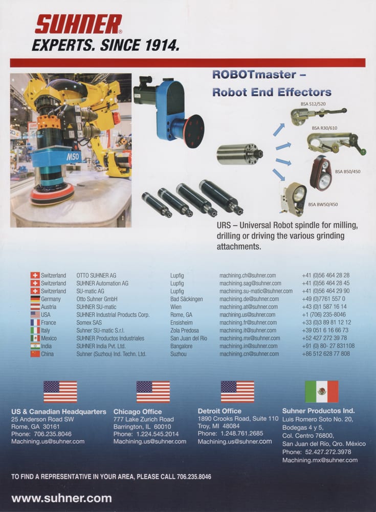Suhner, a leading manufacturer of automated tooling components, slides and multi-spindle components, has expanded its product offering, detailed in a new brochure the Machining Division. Known best for its drilling and tapping units, milling units, machining slides and other specially designed devices for high production work, the company continues to experience increased demand for its machining products and services. As detailed in this new brochure, the Suhner Machining Division offers several new and enhanced products including flex shaft multiple drive system, QUILLmaster Drilling Units, TAPmaster tapping units, stationary and self-feed, flexible-shaft driven drilling units, POLYdrill multiple spindle heads, SPINDLEmaster machining spindles and SLIDEmaster. All are designed for high-production work, especially in the automotive and other mass component market sectors.